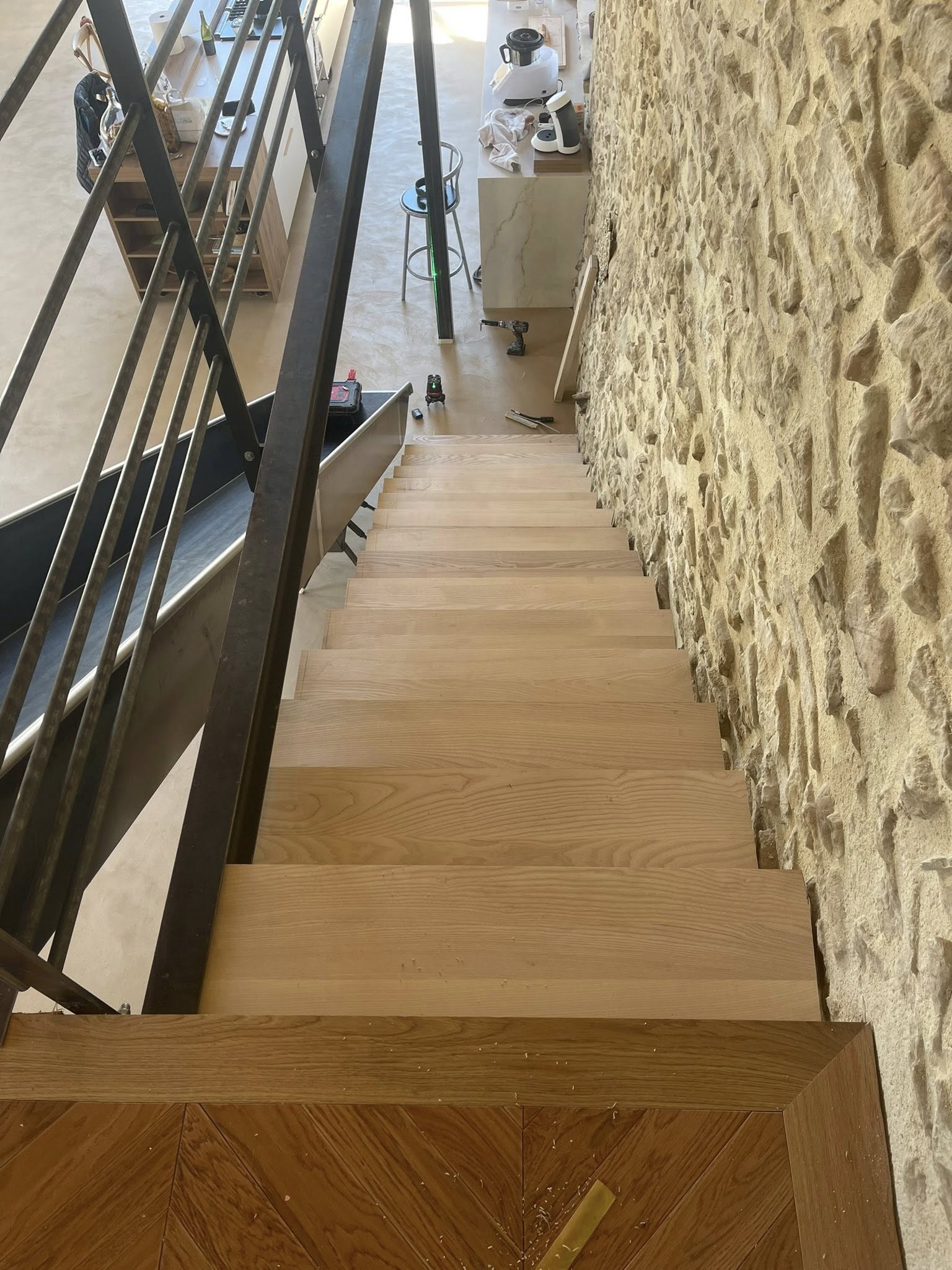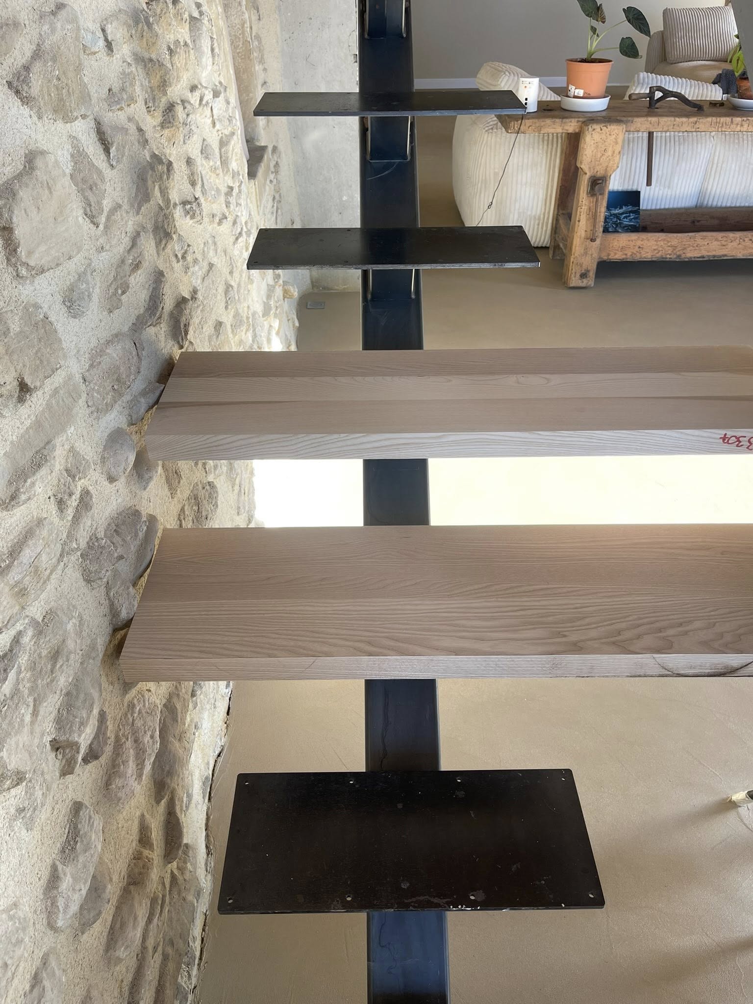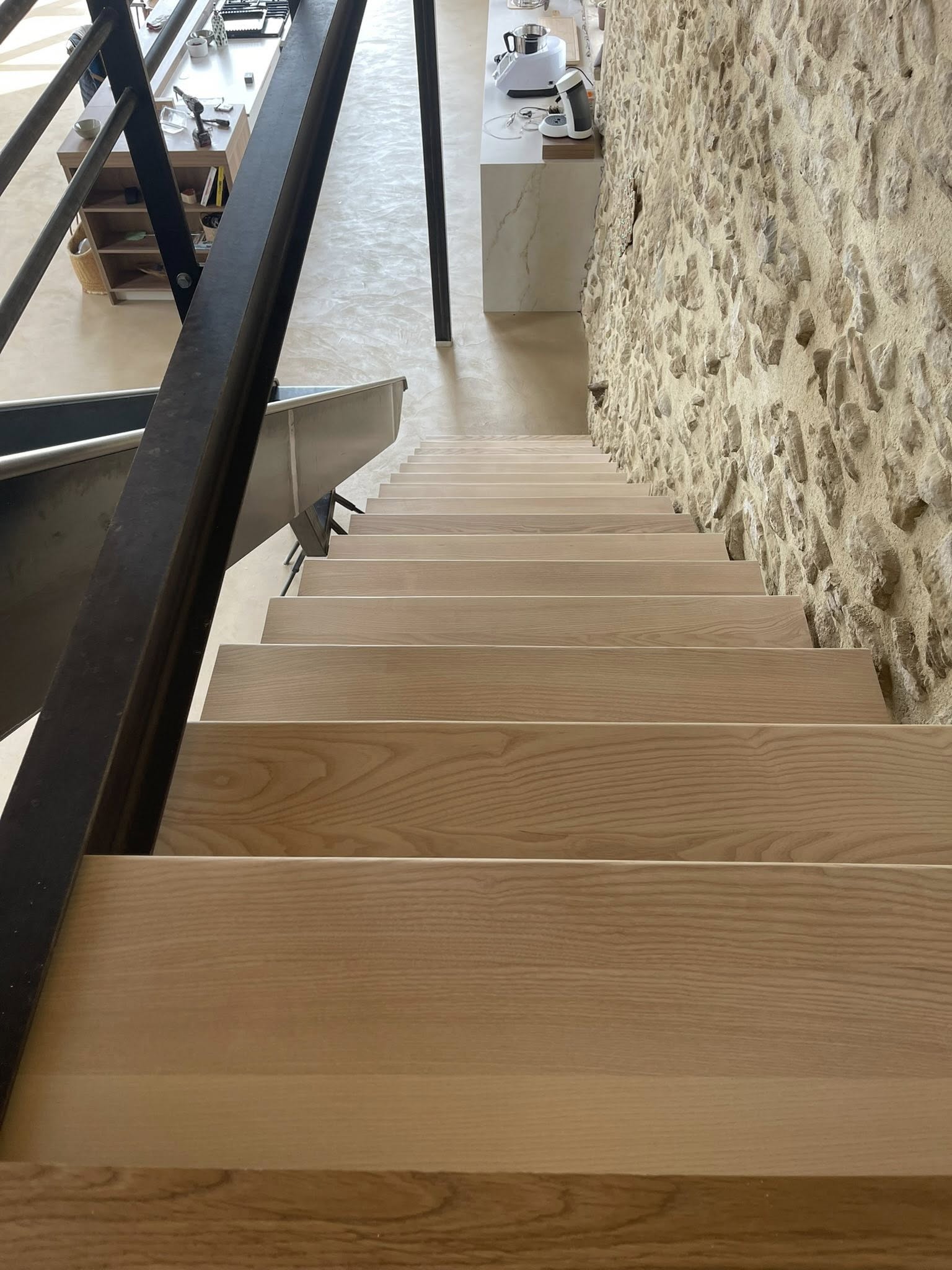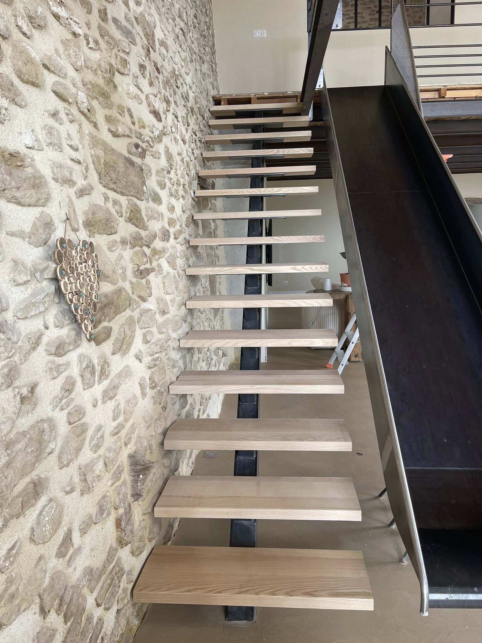 Conception et pose de marches d’escalier en bois massif, réalisées sur mesure pour un ajustement précis. Le frêne, à la fois robuste et élégant, apporte chaleur et raffinement à l’ensemble. Un résultat authentique et durable, parfaitement intégré à cette maison en pierre de caractère.